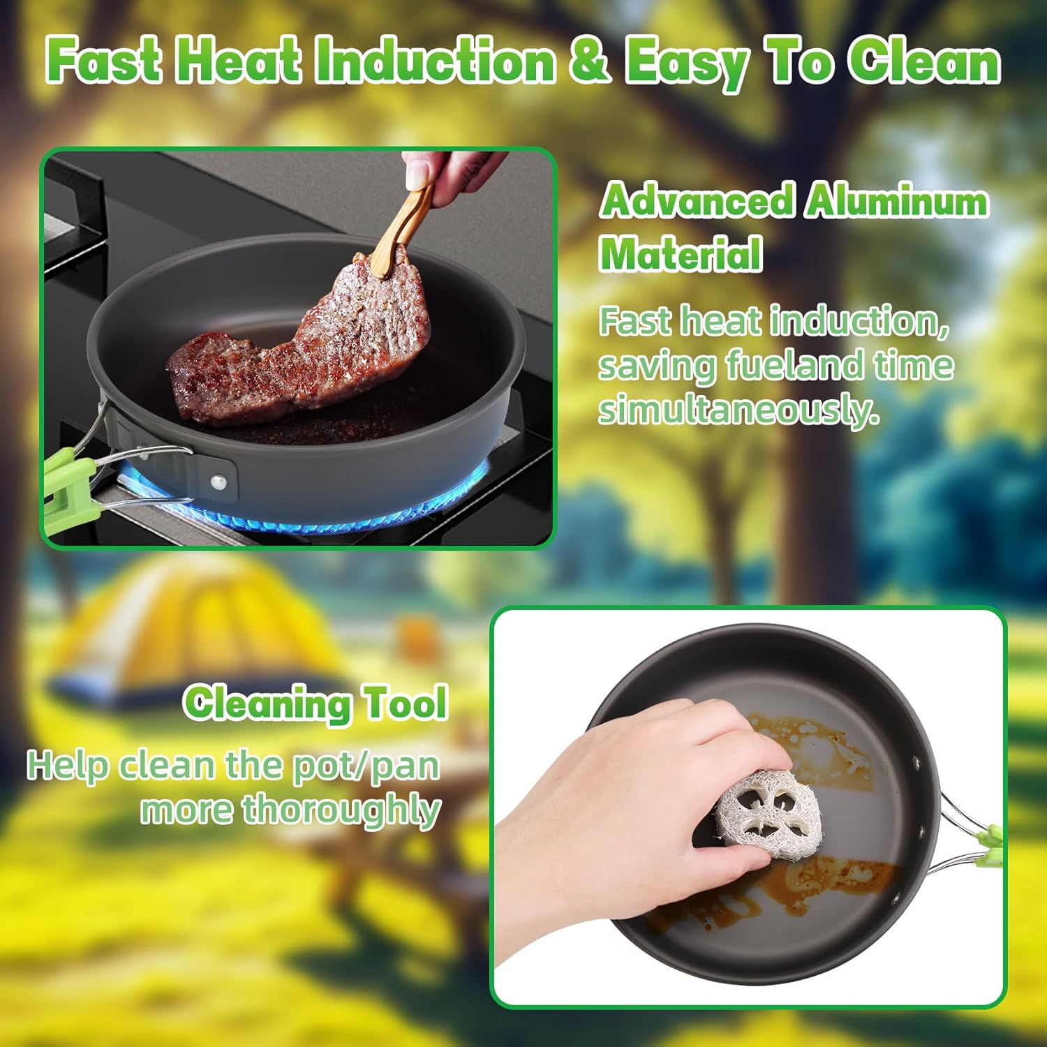 All pieces of the camping cooking set is already, and everything is stacked together and packed into a nylon mesh bag. The total weight is just 2.76lbs, and the folded size measures 7.3 x 7.3 x 5 inches. It is super-portable, making it much more convenient for camping, hiking, backpacking, picnic and other outdoor activities!
