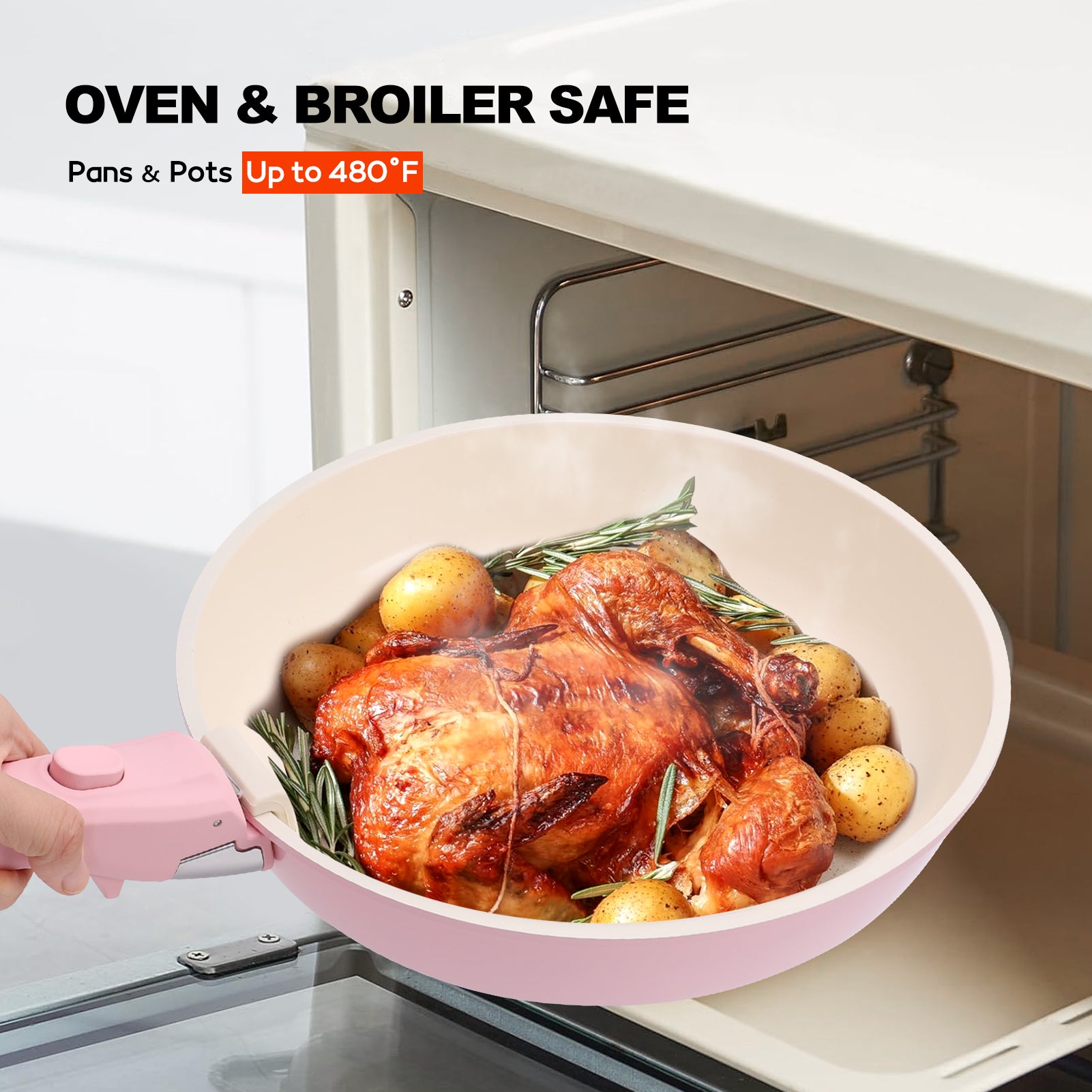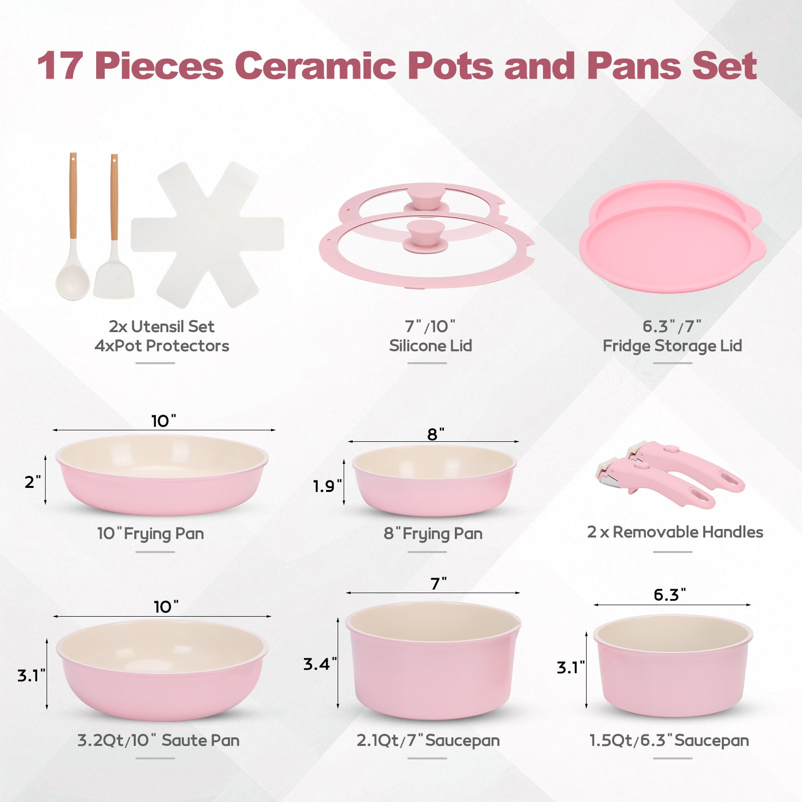 17 Piece Ceramic Pots and Pans Set, Nonstick Cookware Set with Detachable Handles, Oven Safe to 480°F, Induction Compatible, Stackable RV Kitchen Cooking Set, Pink