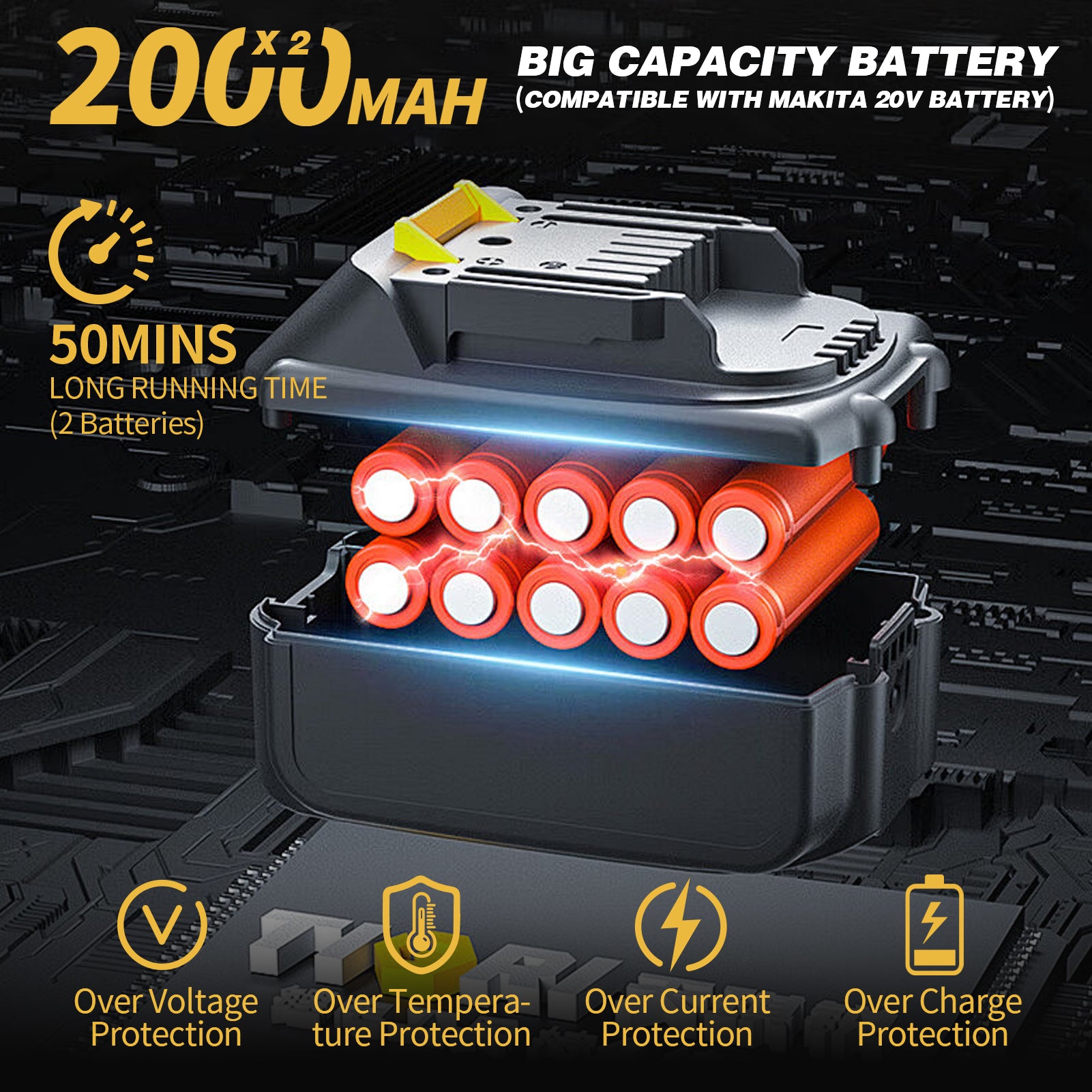 Comes with two high-capacity batteries. Complete larger tasks or multiple jobs without interruptions, providing extended use for your mini chainsaw cordless or battery-powered chainsaw needs.