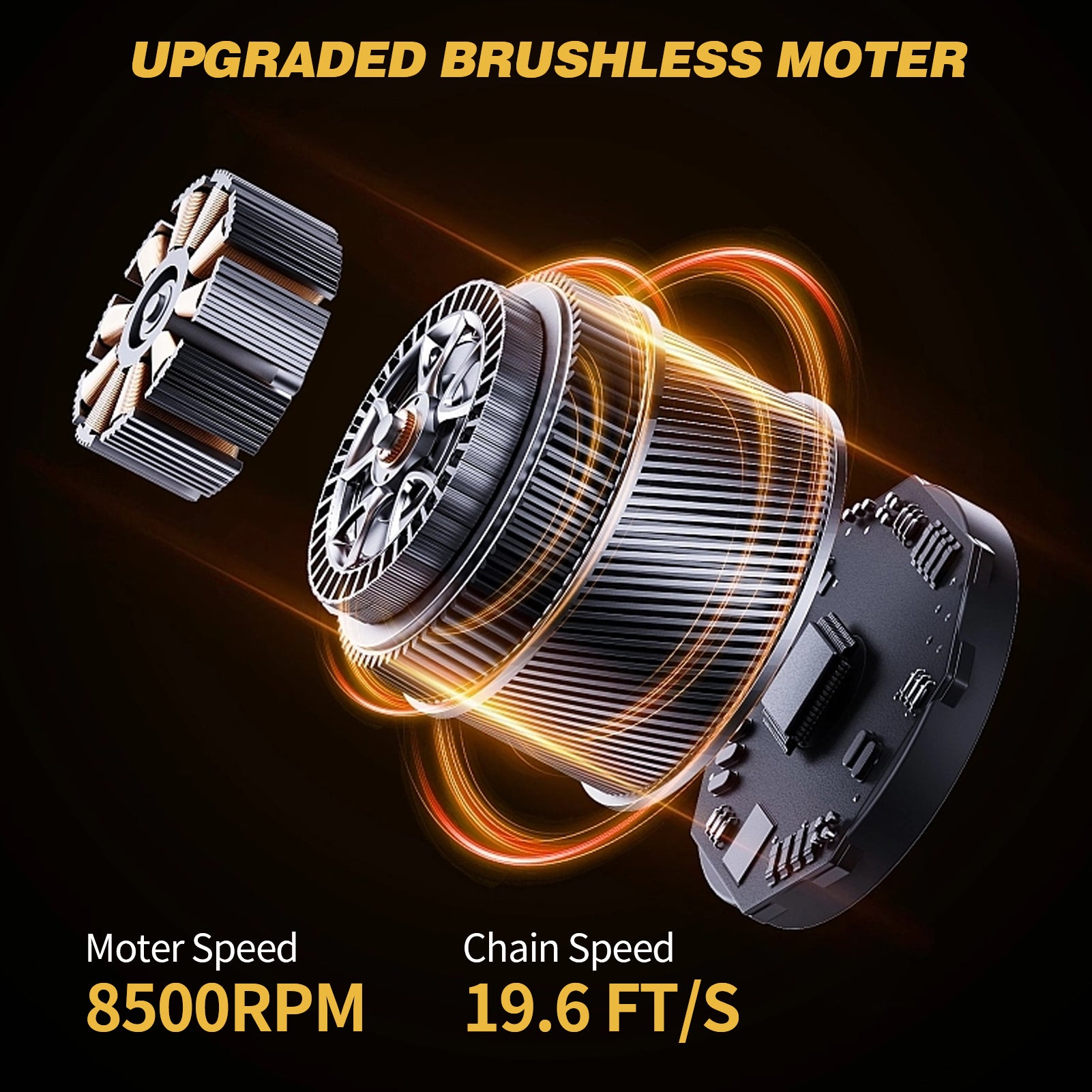 Electric chainsaw is equipped with high-powered bruless motors,26.2 ft/s ultra-high chain speed takes only about 6 seconds to cut a 6" diameter log,cutting 4-inch diameter logs only 4 seconds. This adaptability makes it suitable for a wide range of cutting needs, from high canopies to low shrubs.