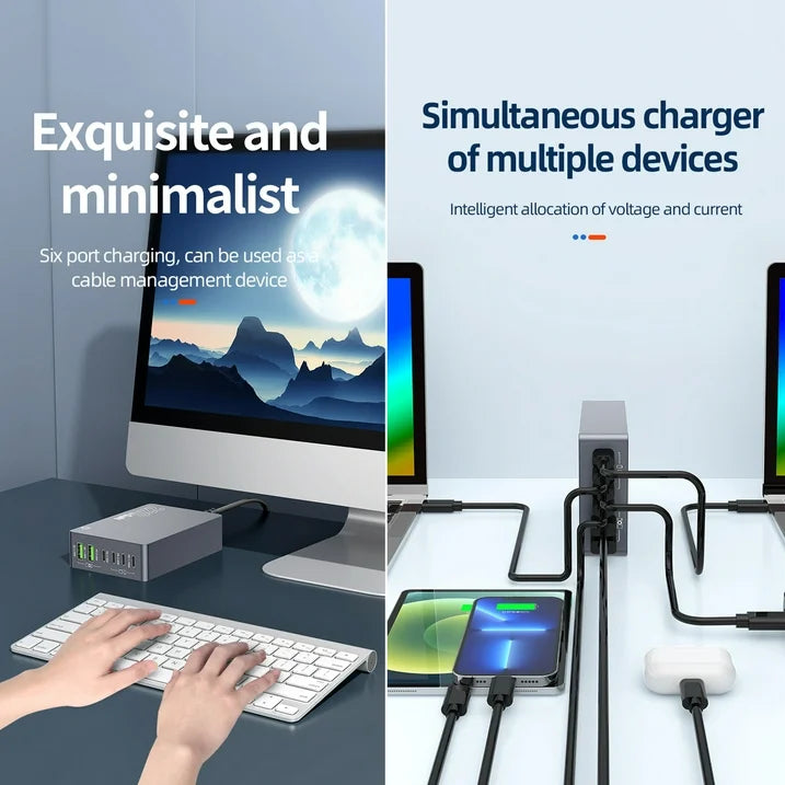 100W x 1 USB C and 30W x 2 USB C and 20W x 1 USB C + 20W x 2 USB A (220W Total), We USB C charging stations feature 6 independent output ports.power delivery Compatible with laptops, phones, tablets, headphones, smartwatches and more. The fast charger type c charger power supply has an input voltage of 100-240 volts, when you connect 6 devices, the power will be distributed the ports to ensure you get the best charge.