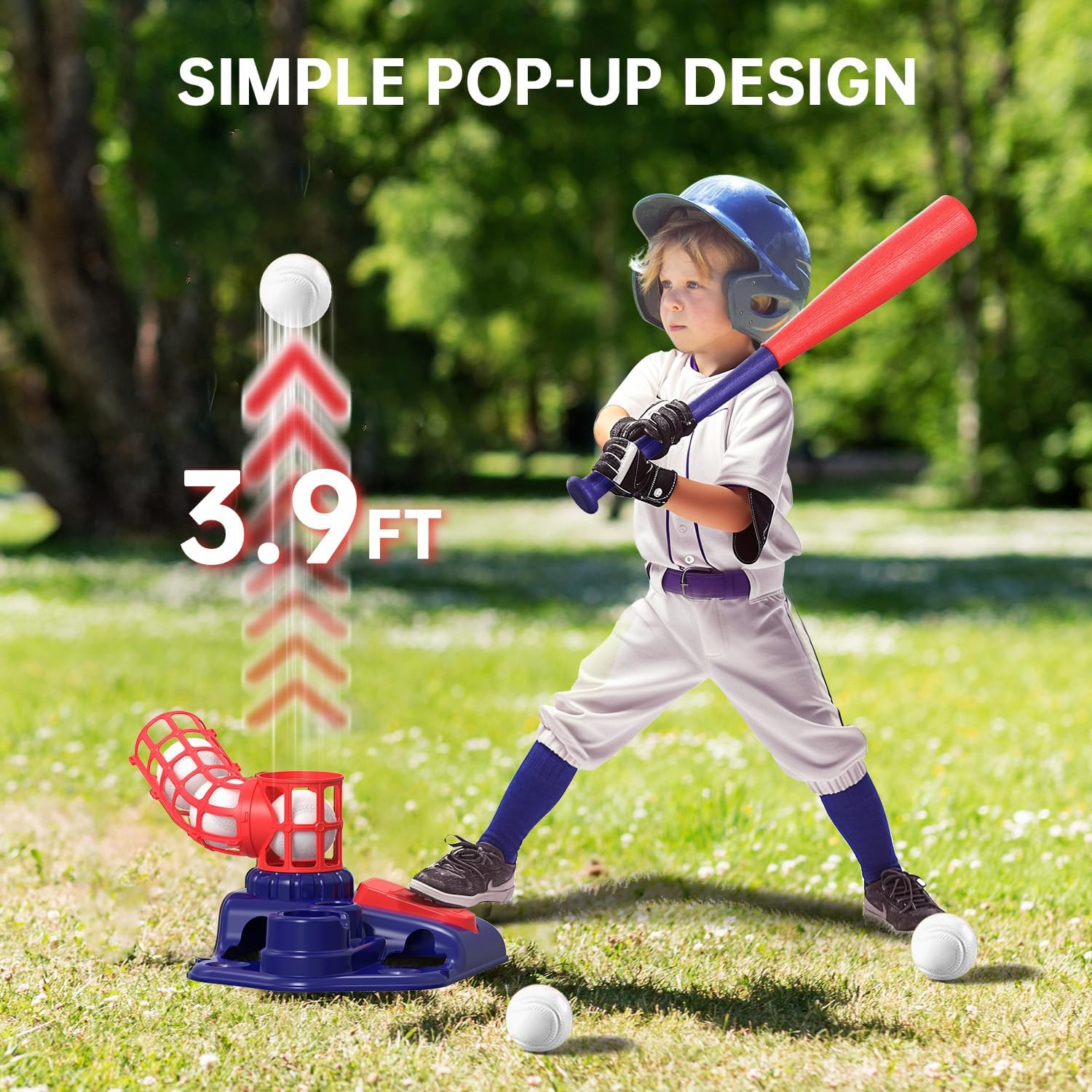 3-in-1 Play for More Fun - ①Hanging Tee: Baseballs with self-stick covers and can be hung anywhere from 17.7" to 33.5" off the ground. ②Tee ball stand: with a retractable bat and 6 baseballs, adjustable height "T" adapts to a child's developing skills. ③Tee popper: hitting baseballs that bounce automatically. These t-ball sets offer three unique playing options for your kids to enjoy outdoor fun!