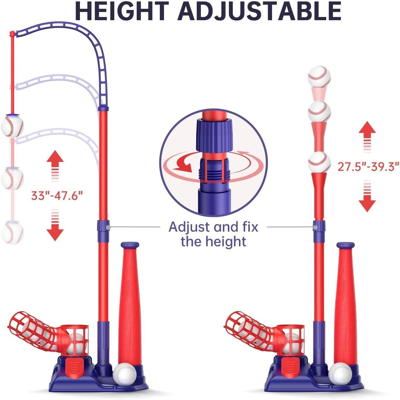 Adjustable Height for Growing Kids - You can adjust different heights for different age groups of toddlers. With adjustable heights ranging from 32.7" to 47.2" for the hanging baseball tee, 29.5" to 41.3" for the standing tee, and a maximum launching height of 37.4" for the pitching machine. adjusted from 24.4in to 39.4in, while the height of t ball stand can be adjusted from 22.6in to 37.2in.