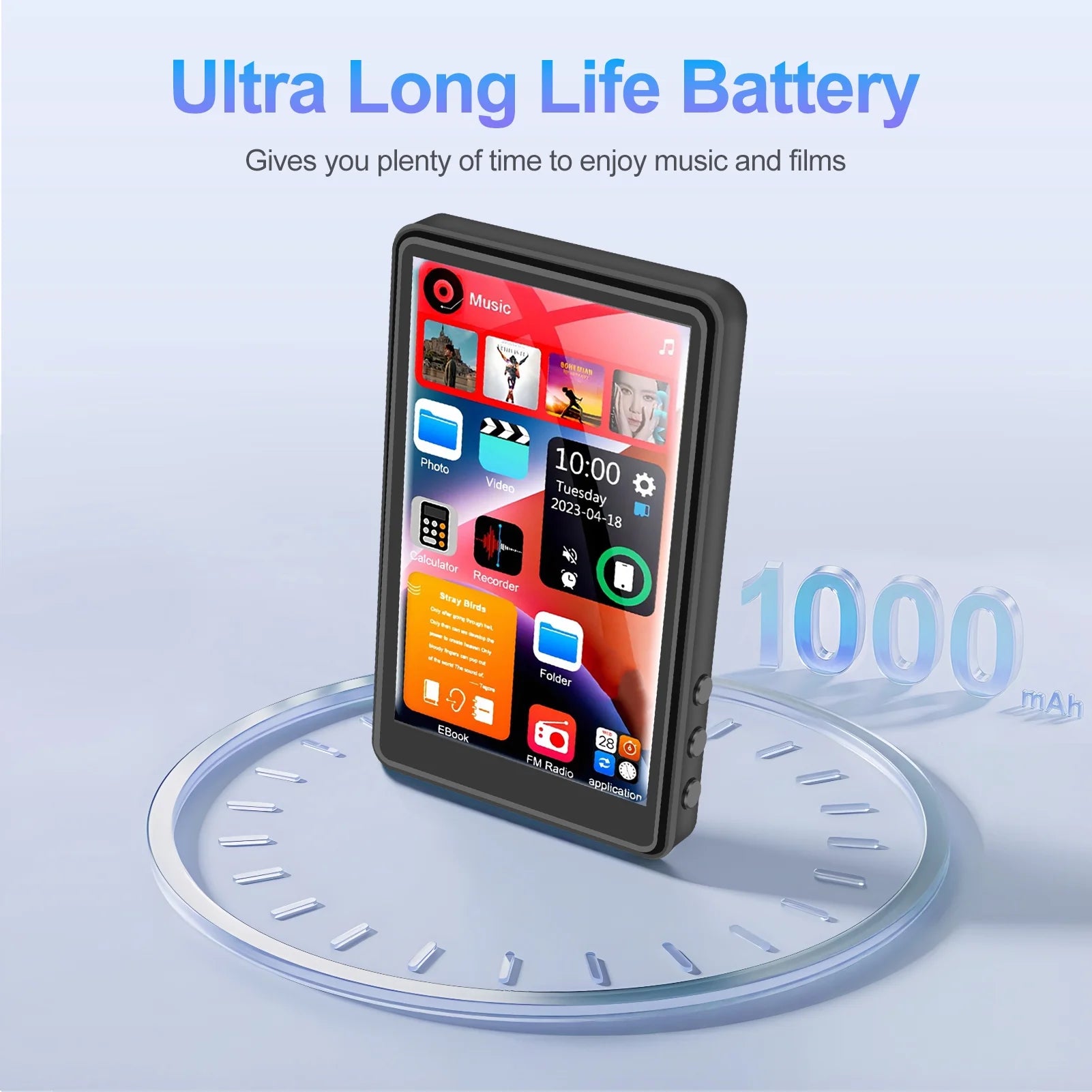This MP4 player is equipped with a 1000mAh lithium battery, and can play continuously for 15 hours using Bluetooth earphones, 20 hours using wired earphones, and 2-5 hours watching videos. And the standby time can last for 1-2 months. Small stature and large capacity, suitable for students, elderly, and sports enthusiasts. It is also the best choice for Christmas and festival gifts.