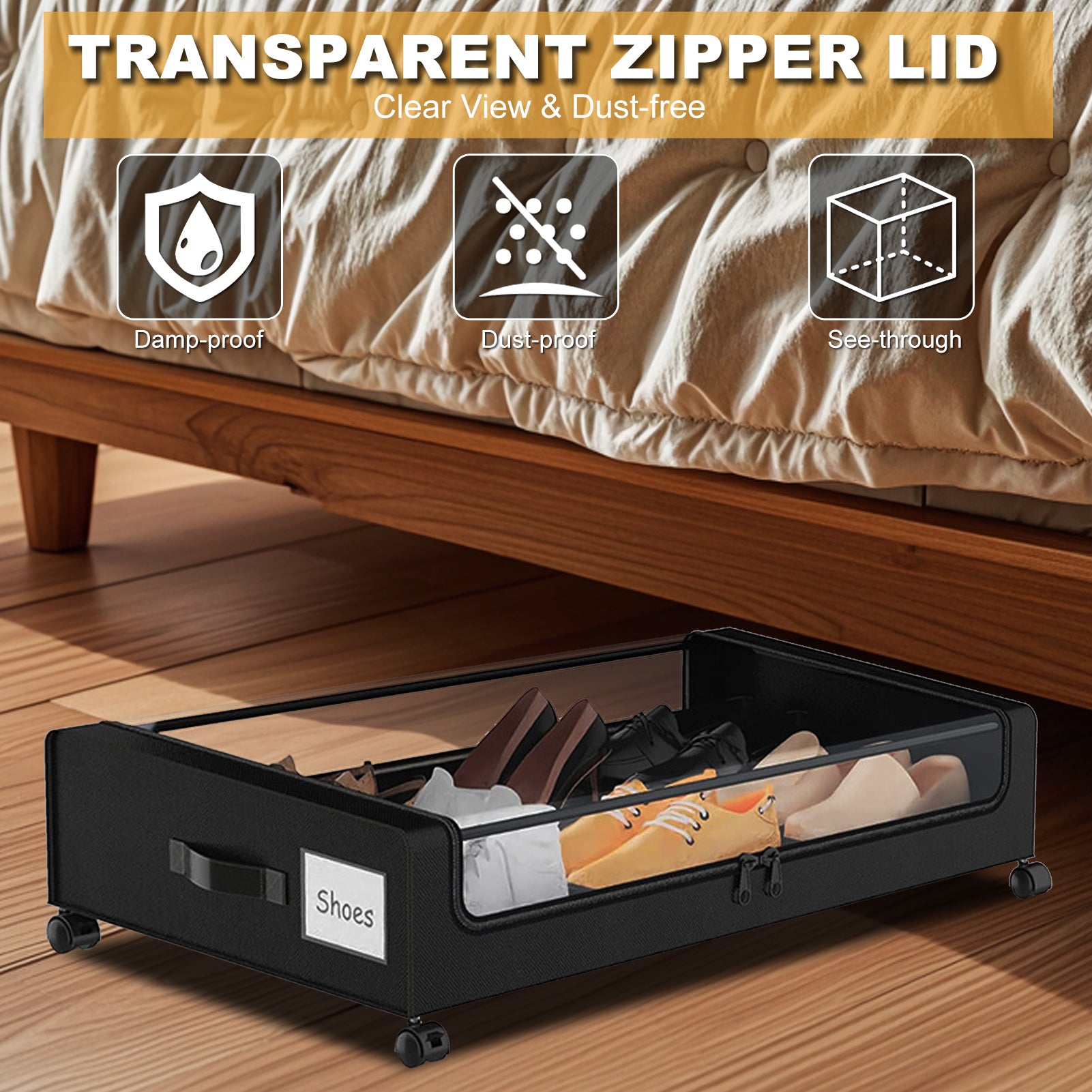 48L Under Bed Storage Containers, Under Bed Shoe Storage Organizer With Clear Lid, Bedroom Storage Organization Drawer For Clothes, Shoes, Toys,Black