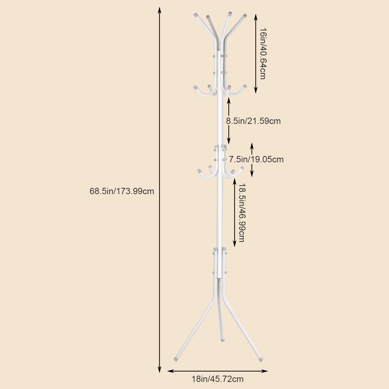 5.7ft Coat Rack Stand Clothes Tree Floor Hats Hanger Holder with 12 Hooks Sturdy Freestanding Multi Hooks Hanging Clothes, White