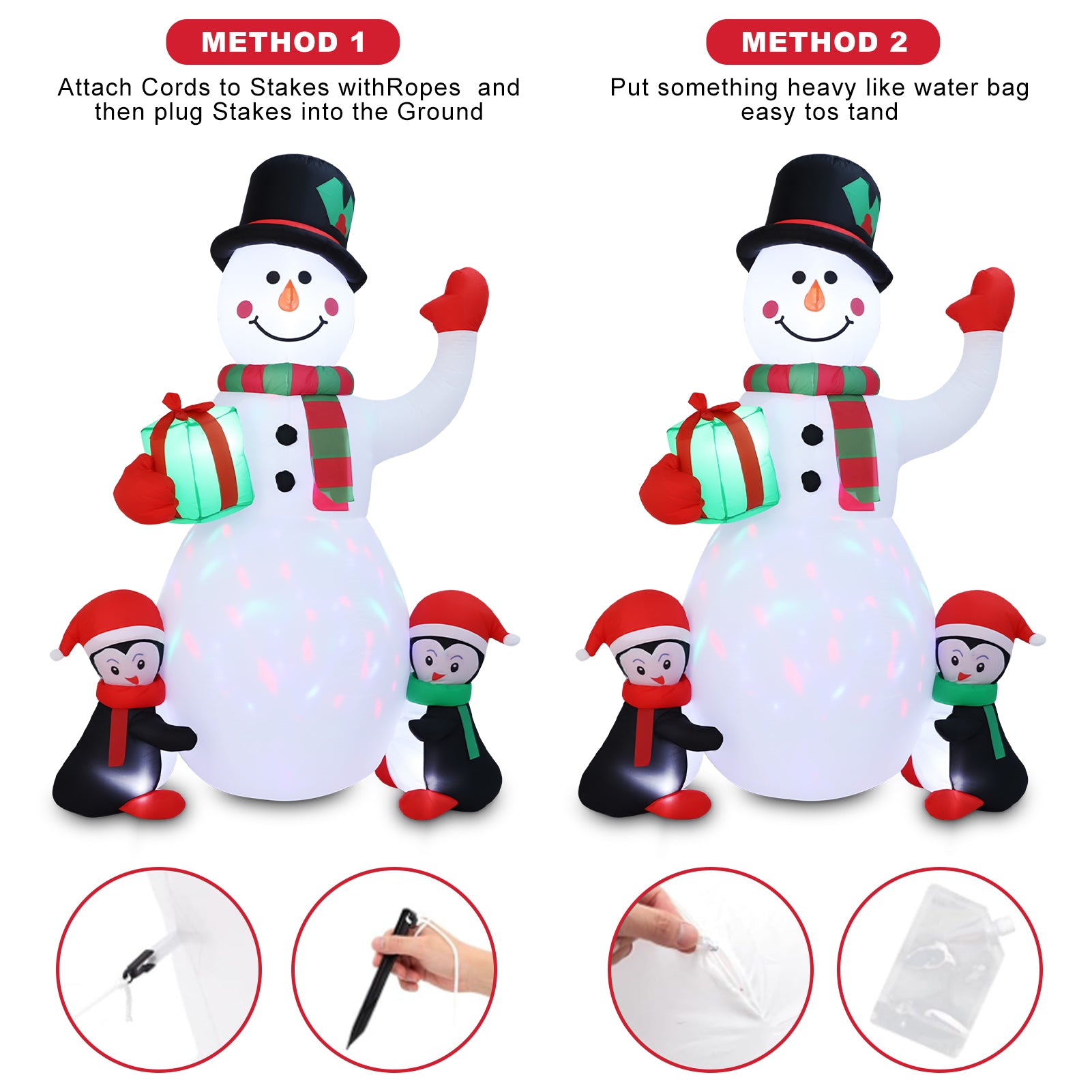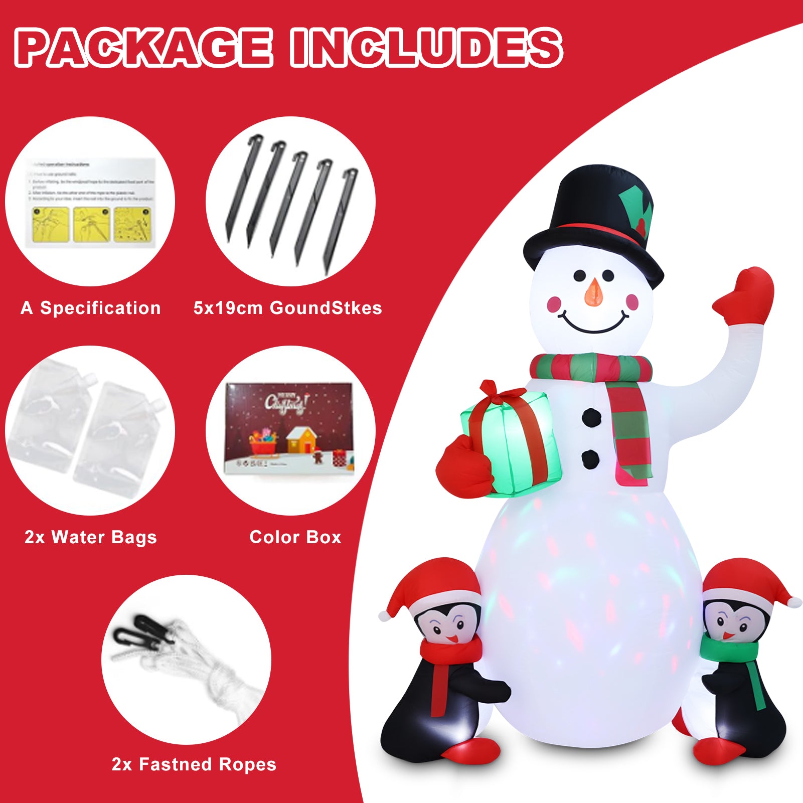 - 🎁Package Included:1 x Christmas Inflatable Branch Snowman with Penguins5 x Stakes,2 x Fixed Sandbags,2 x Tethers1 x Plug with UL Certification1 x Powerful Blower1 x Packaging Box