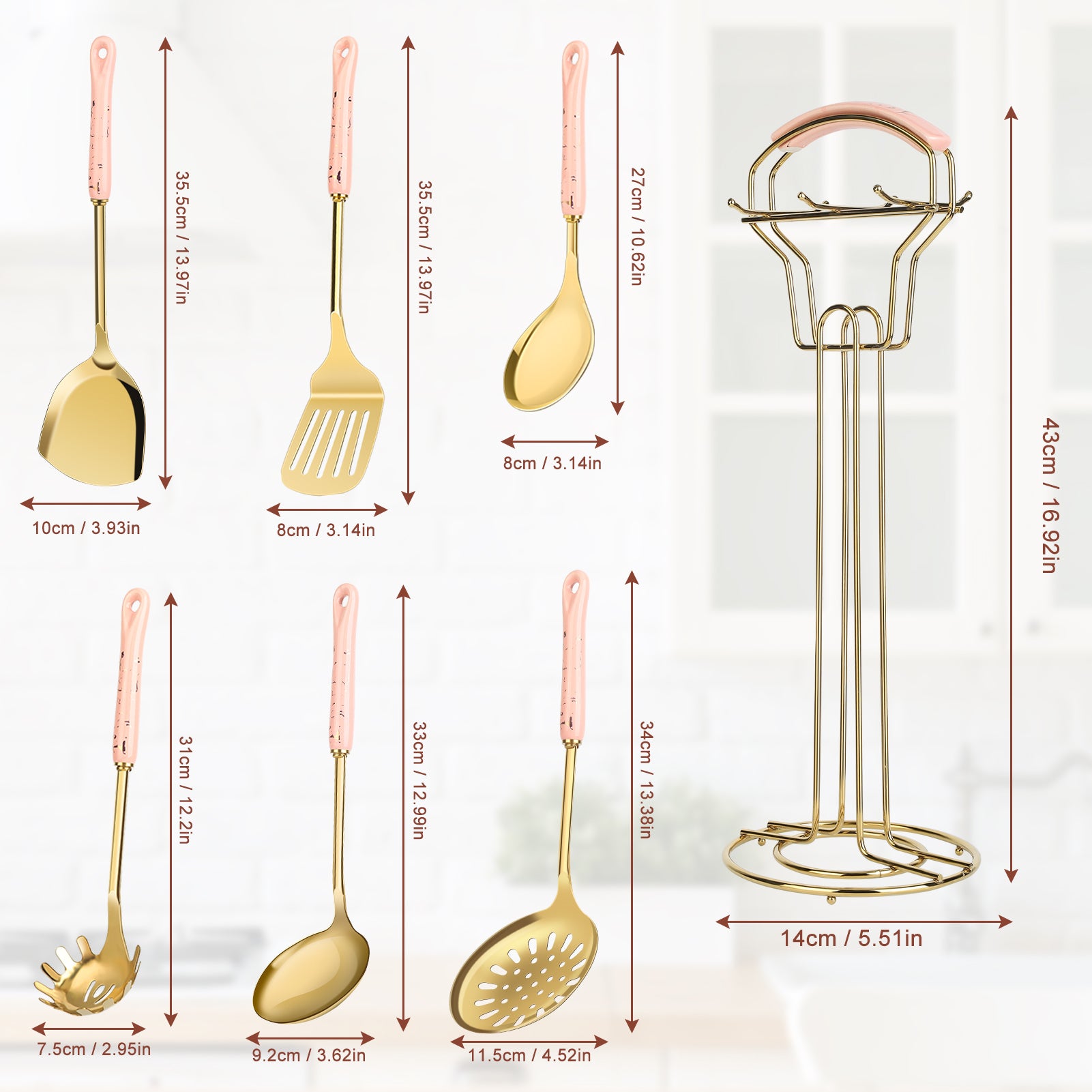 LHCER 7-Piece Kitchen Cookware Set with Ceramic Handled Holder - Includes Slotted Spoon, Slotted Spatula, Large Spoon, Soup Ladle, Spatula, Pasta Spoon