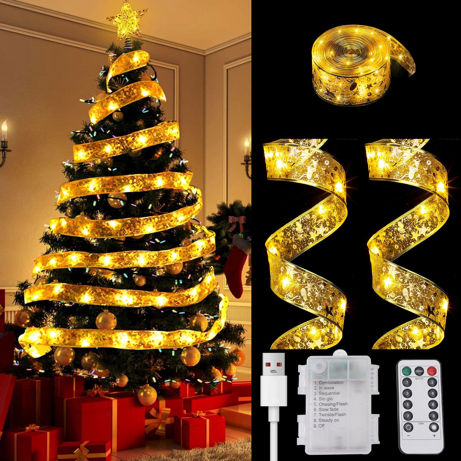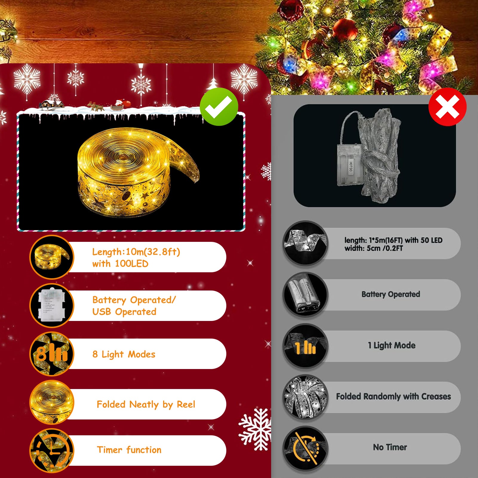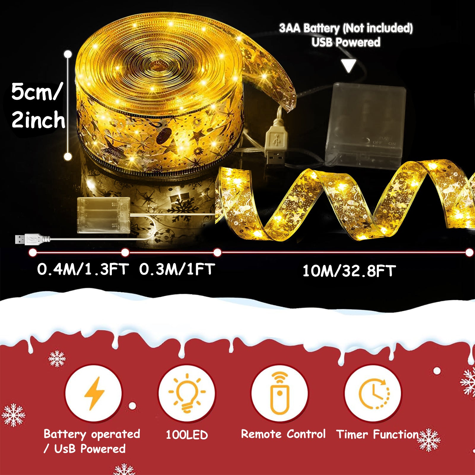 Christmas Ribbon Lights 32.8ft/10m 100 LED Lights Christmas Tree Xmas Lights Battery Operated Copper Wire Ribbon Bows Fairy String Lights for New Year Party Weddings Christmas Tree,Warm White