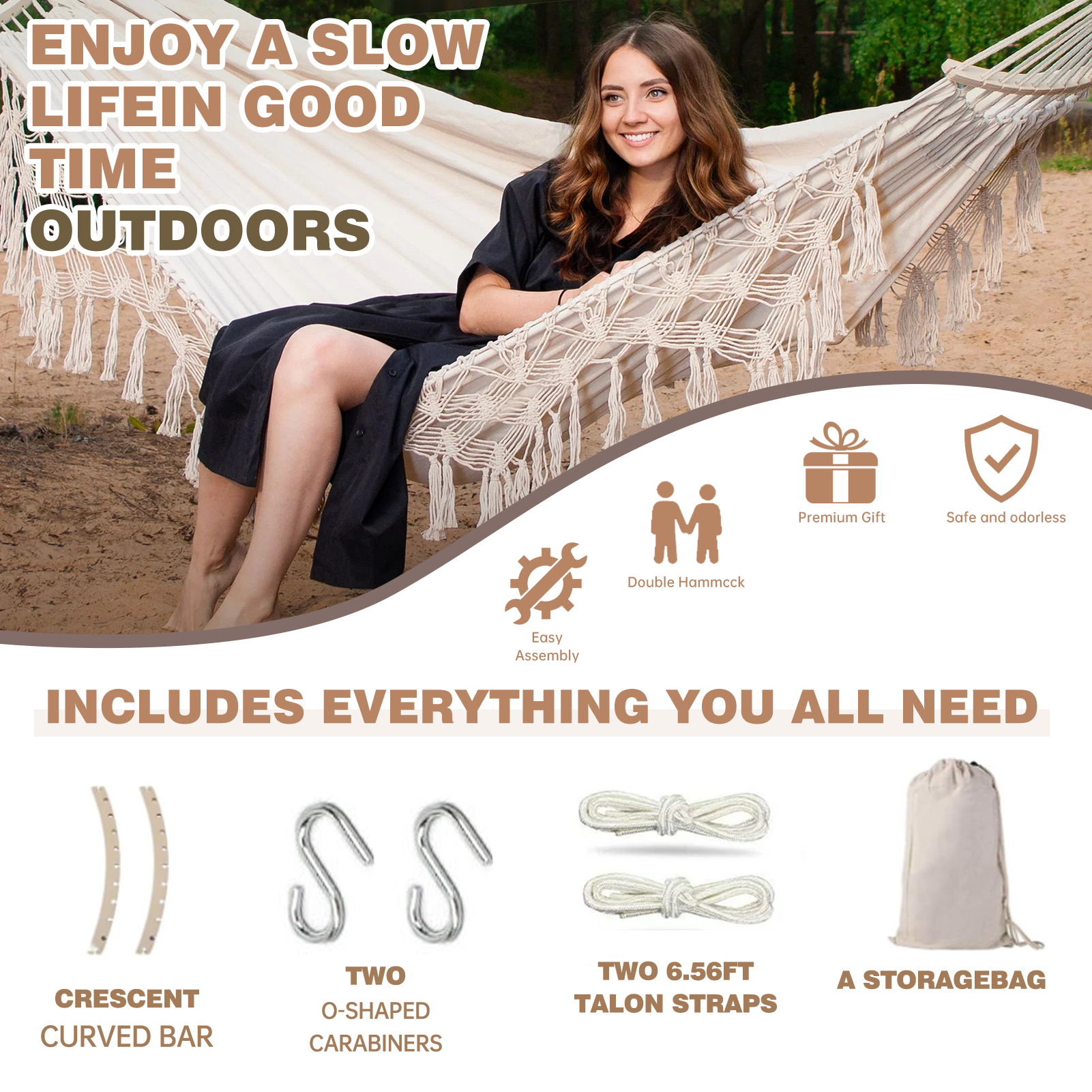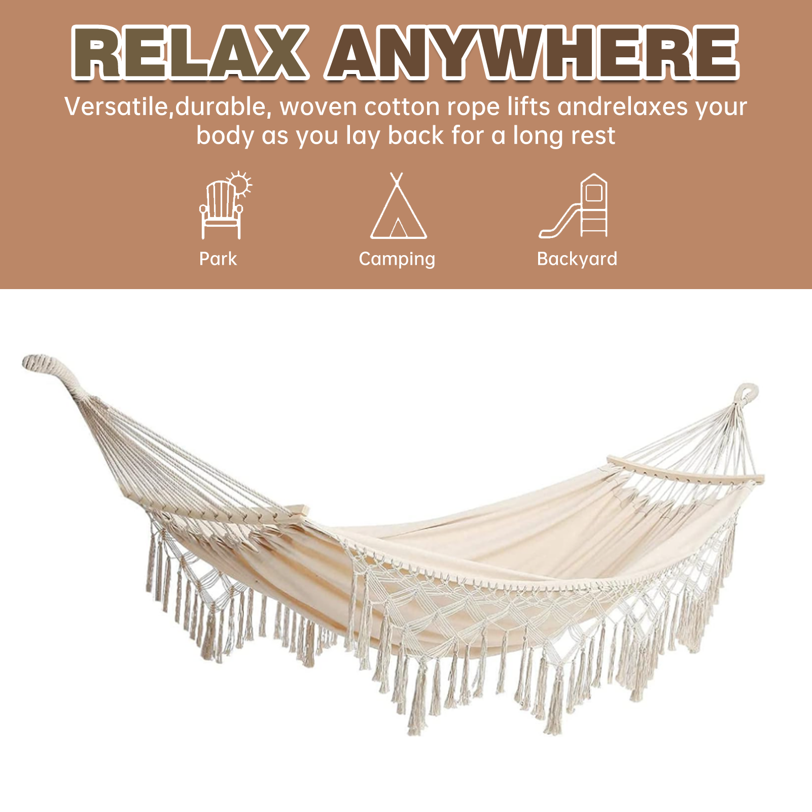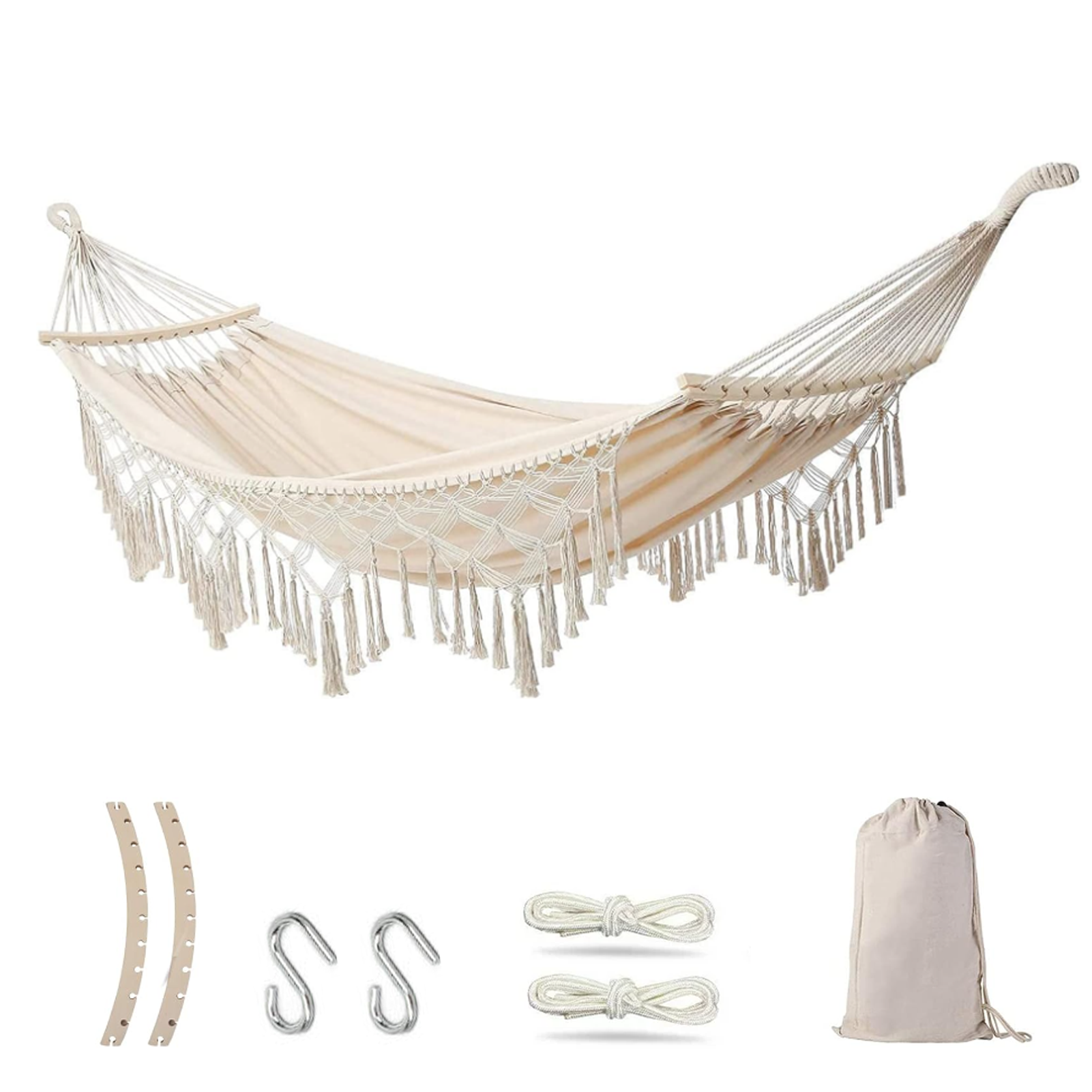 Double Hammock,2-Person Canvas Solid Wood Tassels Fishtail Knitting with Mounting Straps & Curved Rod & Carrying Bag for Outdoor Camping Patio Balcony, Beige