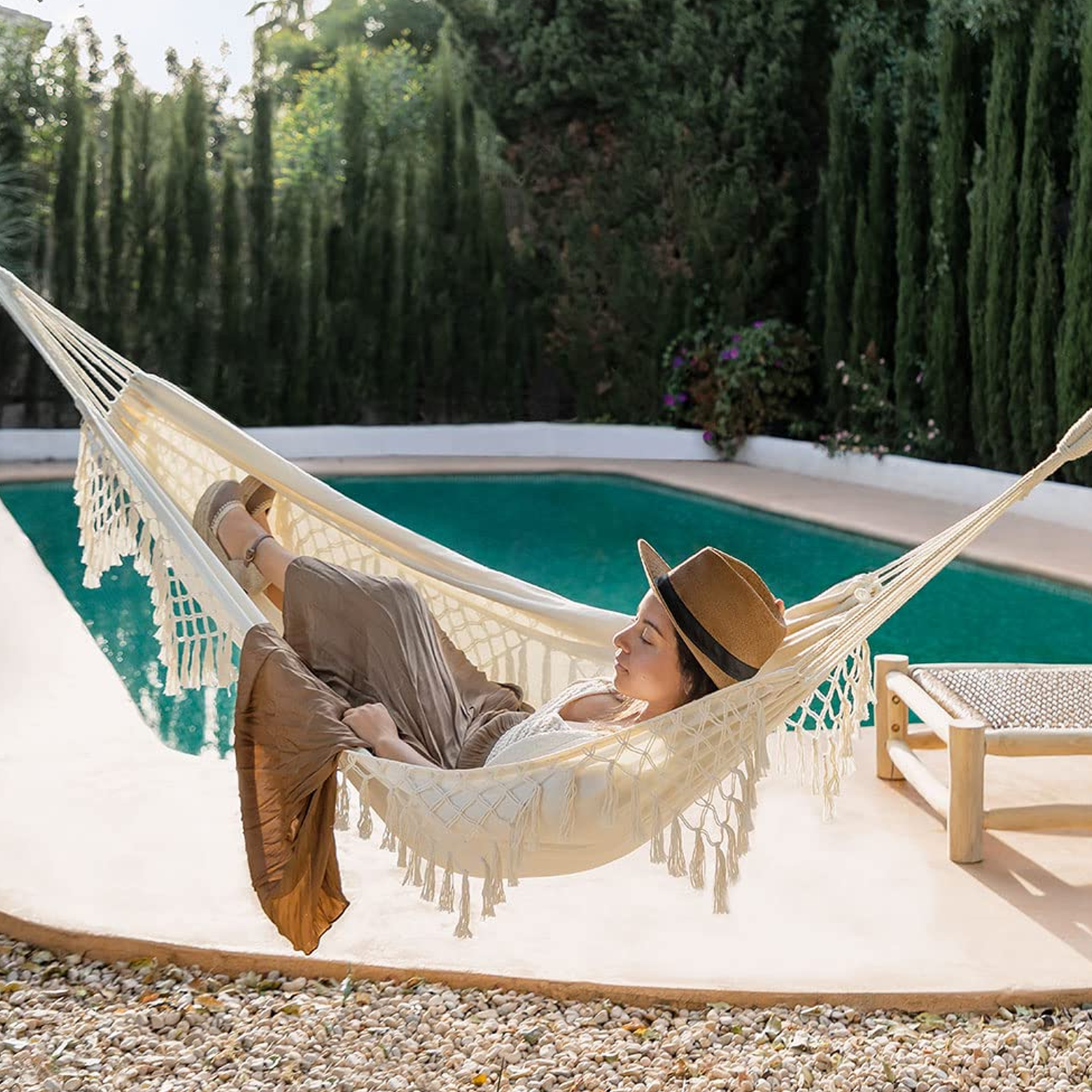 Our Two-Person Hammock, the choose of comfort and style for shared relaxation. Crafted from a soft yet blend of thick canvas and fishtail knitting, this hammock is designed to cradle you and your companion in pure bliss.