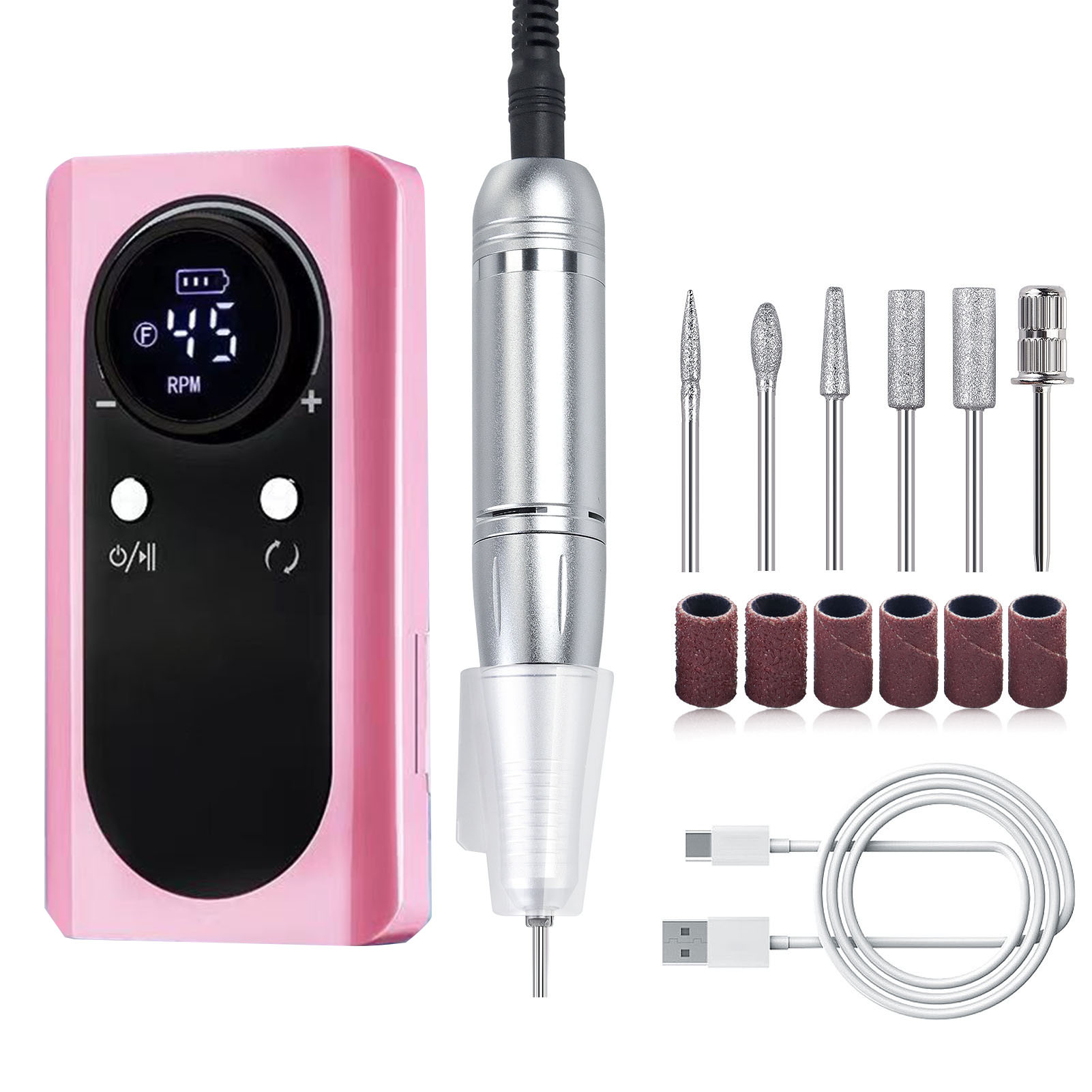 Electric Nail Drill, Cordless Portable Electric Nail File Set with 6 Bits, 45000RPM Professional Rechargeable Forward & Reverse Nail Drill Kit with Display, for Acrylic Nails/DIY Manicure & Pedicure