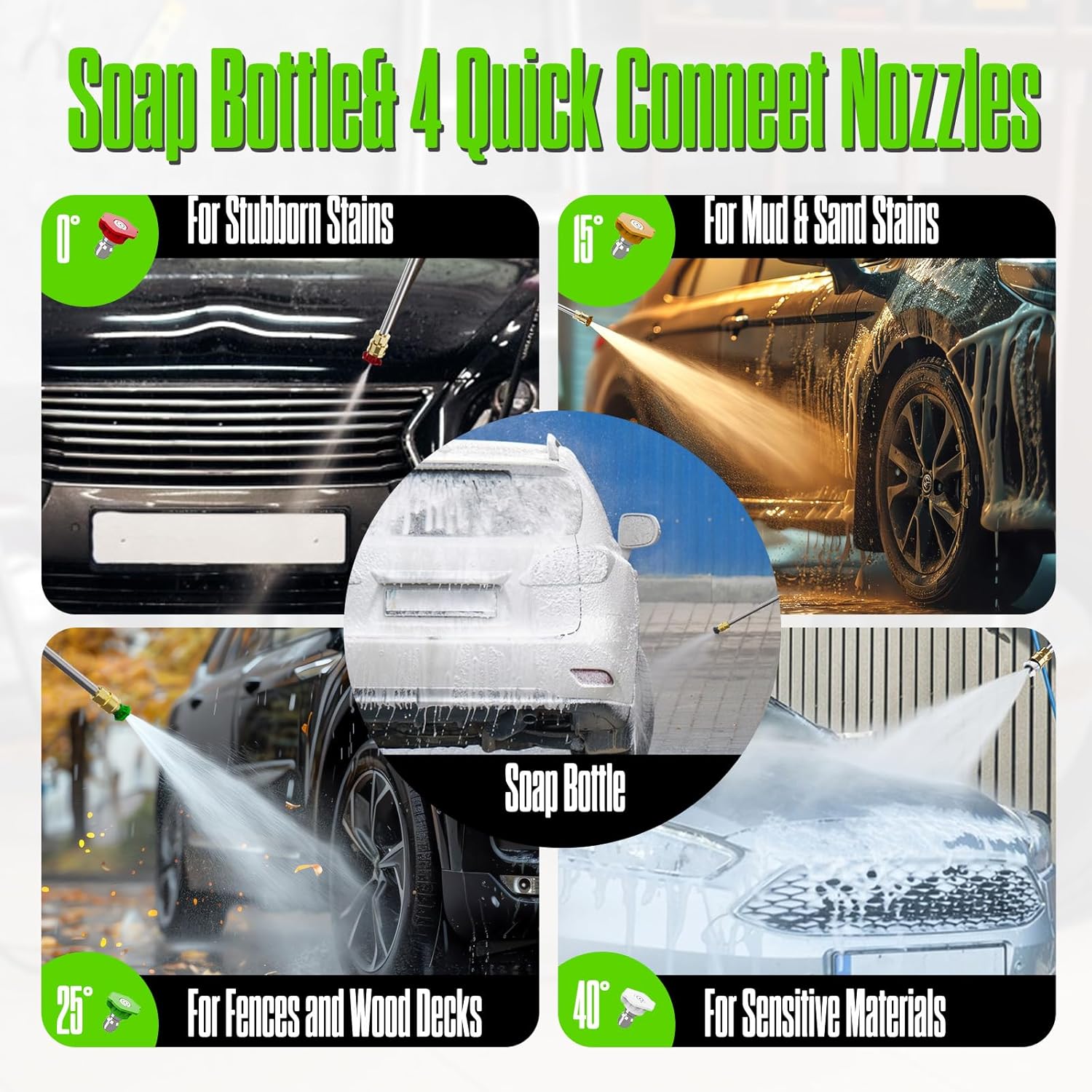 Efficient Performance: The electric pressure washer delivers up to 4200 PSI water pressure and 2.8GPM waterflow, offering exceptional cleaning power to remove stubborn dirt with long lasting performance.Stable Structure: Equipped with four 360° swivel wheels and wheel locks, this power pressure washer ensures stability on uneven surfaces and easy maneuverability, ensuring easy movement.Convenient Use: With a 32ft power cord (with GFCI protection) and a 32ft pressure hose, this washer provides ample range of motion during cleaning tasks without frequent repositioning.Easy Storage: The cleaning machine features a washer holder and hose reel on the side for easy protection and prevention of high pressure hose tangles, making winding and unwinding simple.Multifunctional Design: This pressure washer comes with 4 tips for various cleaning tasks. Features foam watering can, garden pipe adapter, faucet adapter and other accessories, can be used for vehicle cleaning and maintenance, railing cleaning, patio cleaning, other kinds of large objects cleaning tasks and other applications. -