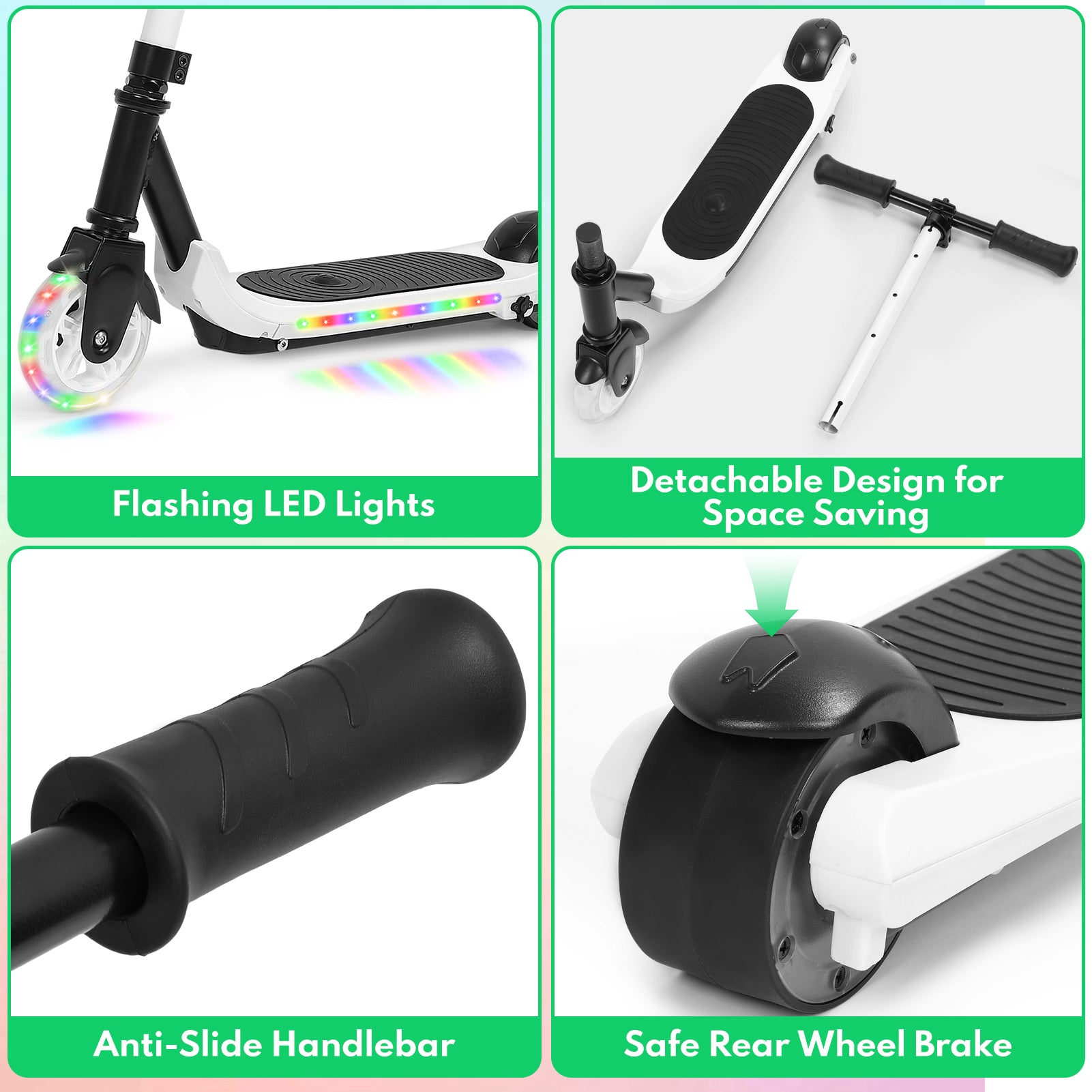 Featuring a kids electric scooter with dual brakes (mechanical + foot brake), the E scooter ensures quick, smooth stops and safe riding.