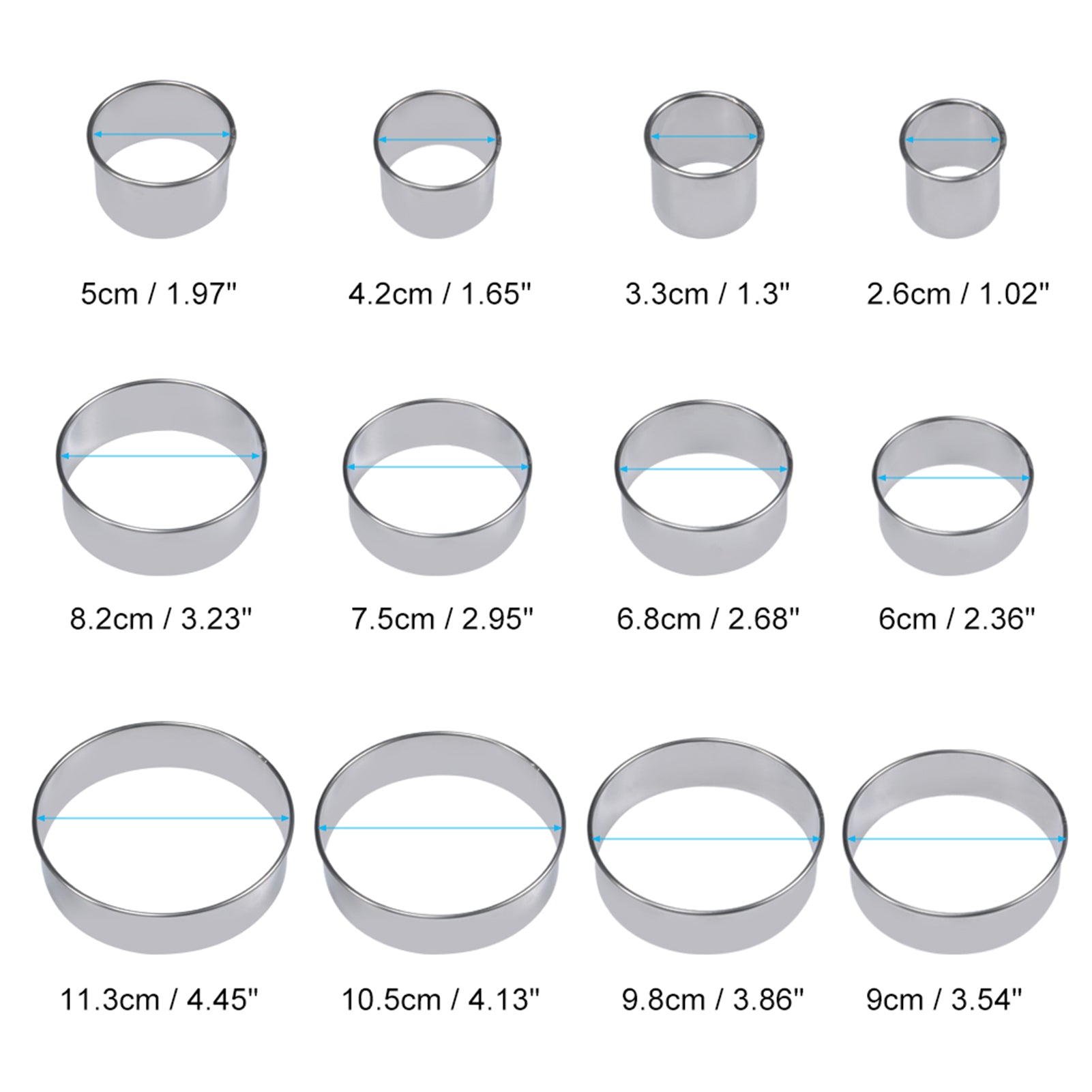 12 PCS CUTTER SET: 12 pcs donut hole cookie cutter set for baking, diameter are: 1.0 in/2.6 cm, 1.1 in/3.3 cm, 1.6 in/4.2 cm, 1.9 in/5.0 cm, 2.3 in/6.0 cm, 2.6 in/6.8 cm, 2.9 in/7.5 cm, 3.2 in/8.2 cm, 3.5 in/9.0 cm, 3.8 in/9.8 cm, 4.1 in/10.5 cm, 4.4 in/11.3 cm. High: 1.2 inche/3.2 cm for all.