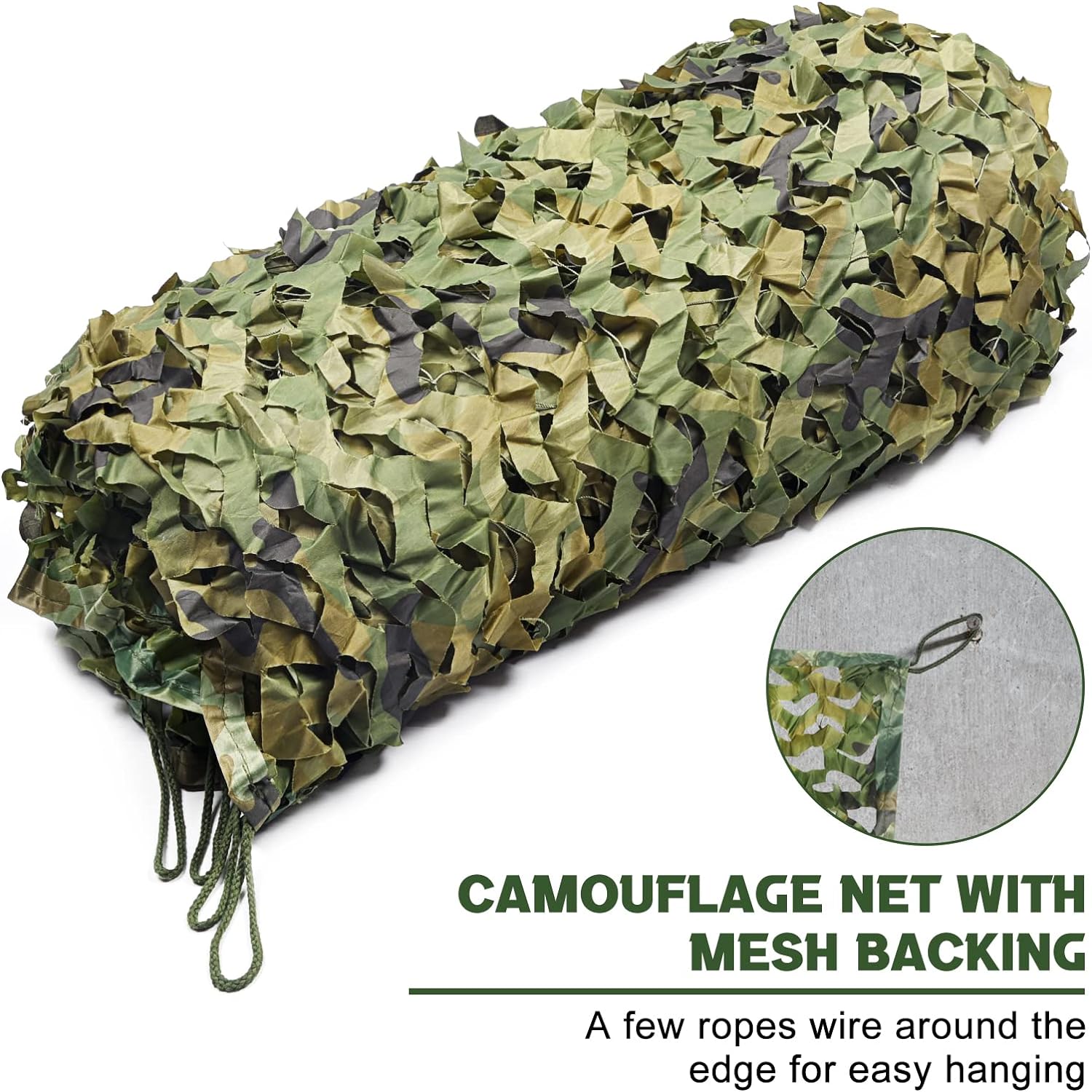 It is standard camo net with a structural mesh net added. This improves the strength of the netting and allows it to span larger areas. The outer edges of the net have para-cord to support the entire net structure. Both the para-cord and mesh backing are secured to the net with stainless steel rings for added strength and durability. All 4 corners have strong, para-cord loops which function as attachment points - ideal for hanging or for providing shade cover.