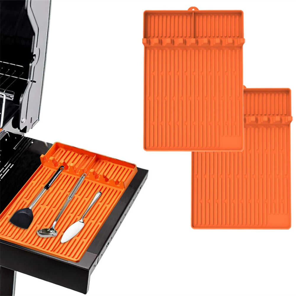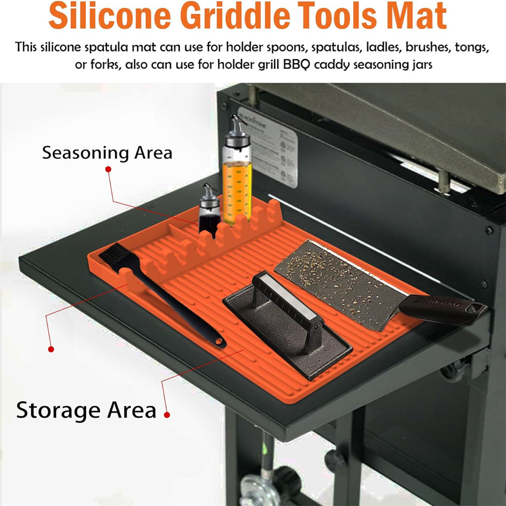 Elevate your cooking experience with our resilient 15.75"x11.81" silicone spatula mat. Crafted for durability and versatility, it effortlessly transforms your Blackstone side shelf into an organized haven. Use it as a grill BBQ caddy, seasoning jar holder, or ladle spoon organizer, keeping your kitchen, cooking space, and countertop spotless.