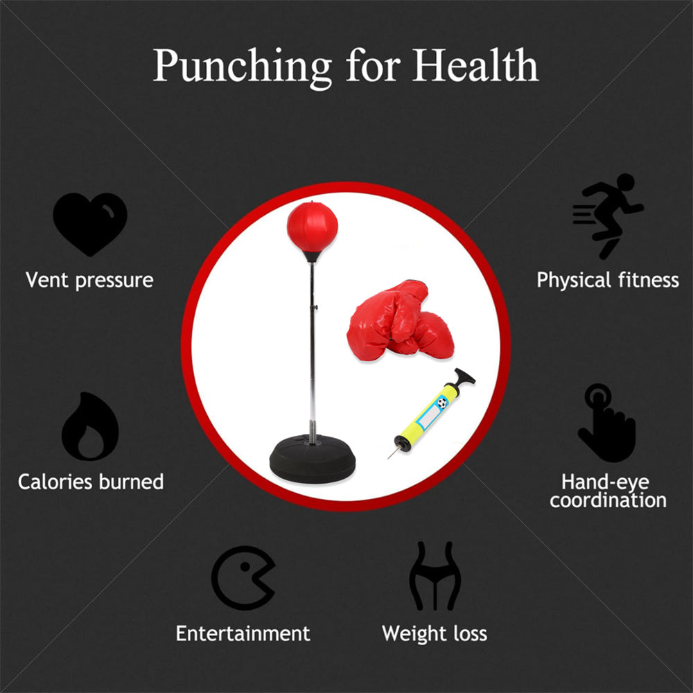 Our boxing set includes an inflatable punching bag, air pump, 1 pair of padded boxing gloves, a sturdy base and an adjustable stand.