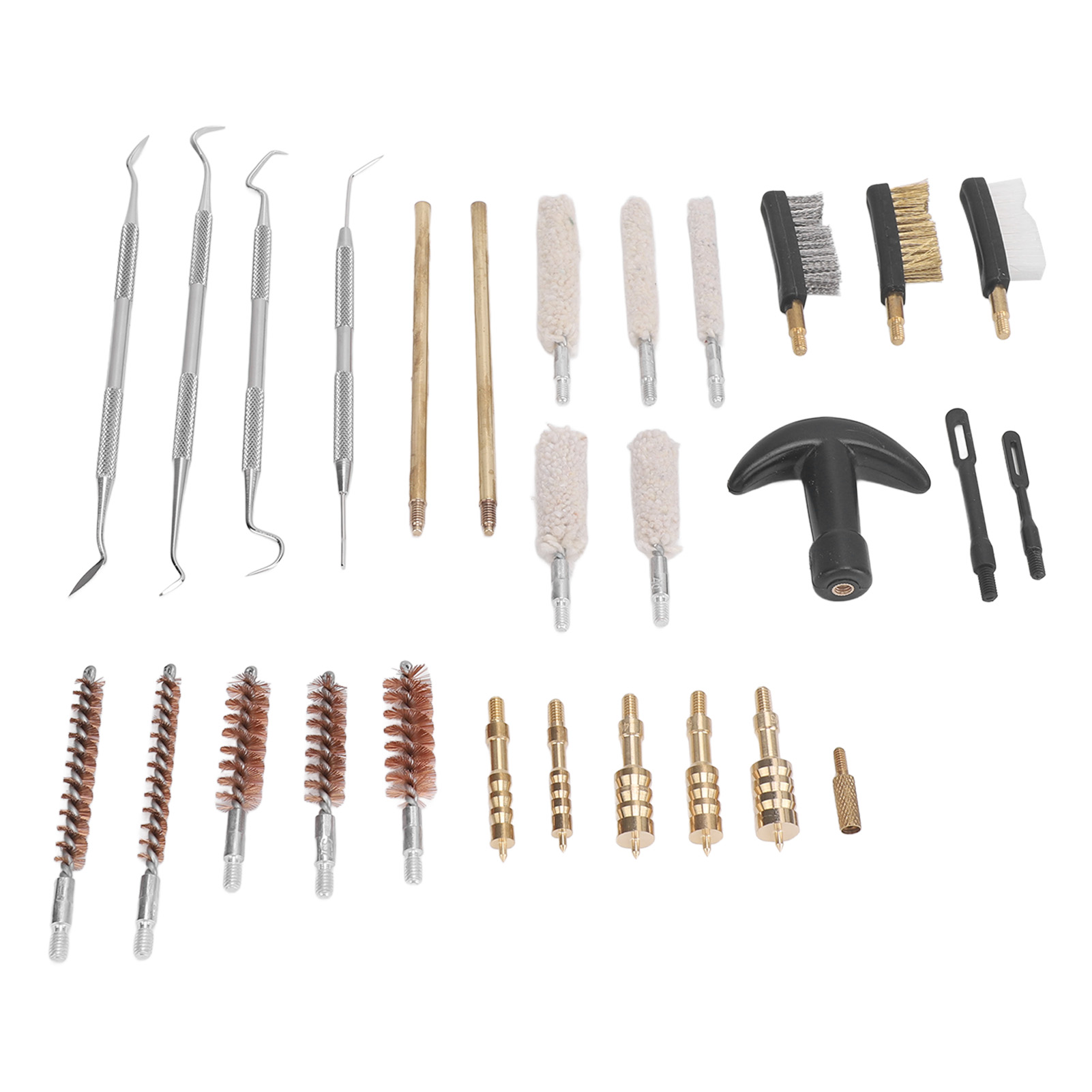 All pieces are made of quality materials. Complete kit for cleaning handguns. Includes brushes, jags, mop, rods, tips, patches, pick, cloth, gloves, swabs, and more.