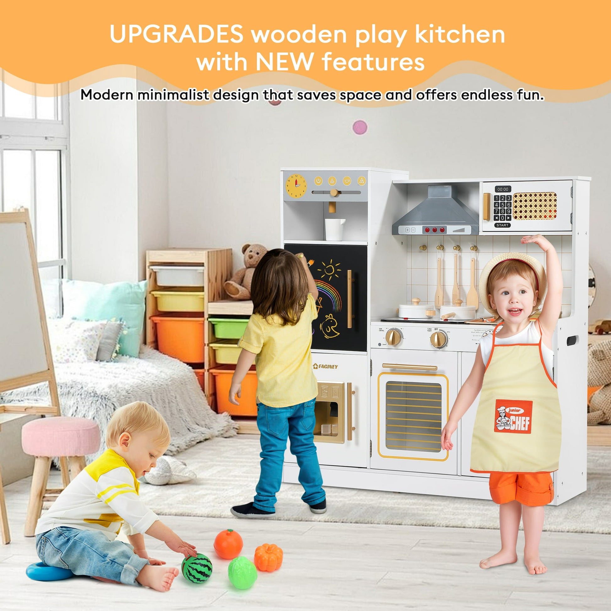 【Over 20 Accessories】The FAGINEY kitchen set comes with over 20 cutting-play fruit and vegetable toys, finely crafted wooden kitchen utensils including spatulas, knives, a saucepan, a frying pan, and a little apron. It also includes 3 ice cubes and two cups. The rich assortment of accessories and play possibilities means you can make any dish! Whether it’s for birthdays, holidays, or just to show your love, this is a perfect gift for children aged 3 and up.