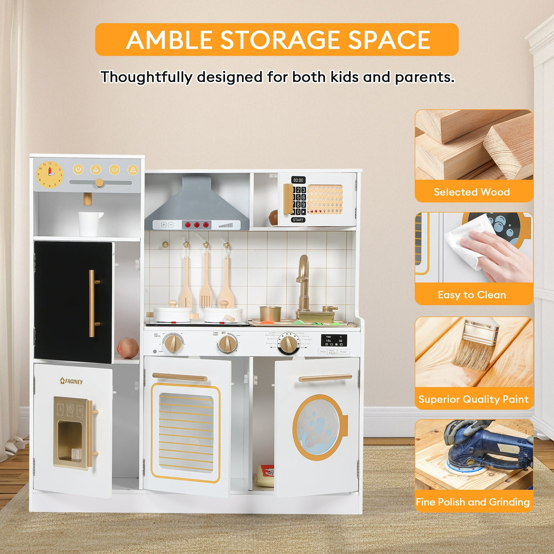 【Safe Playtime】Our toddler play kitchen set is made from child-friendly wood, ensuring a safe play environment without any harmful designs. The materials are smooth, easy to maintain, and clean, allowing kids to play for hours each day safely. Your child will love the engaging lights, sounds, and water features—no kid can resist these lively elements!