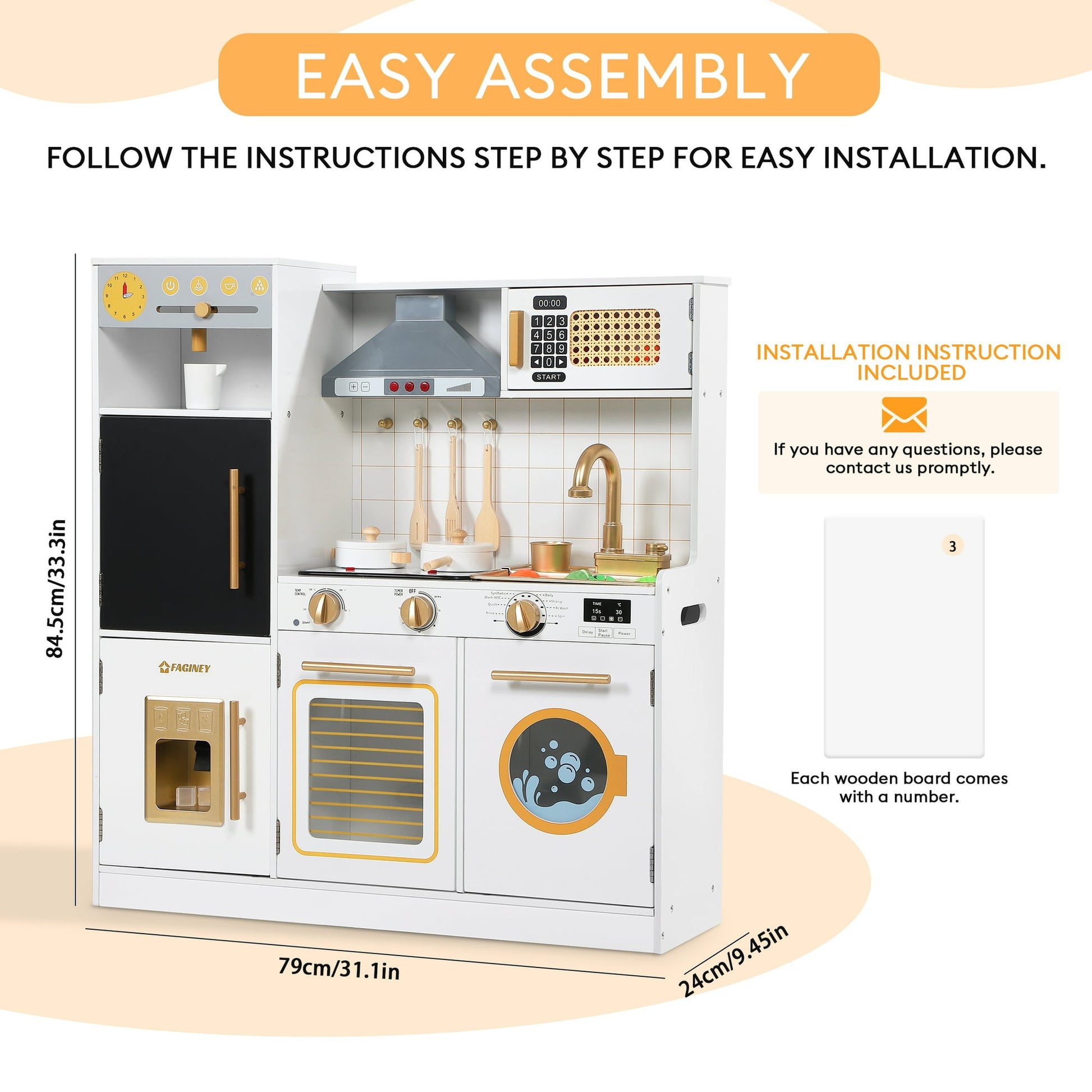 - 【Easy Assembly】Parents, this toy kitchen comes with a clear instruction manual. The assembly process is straightforward with numbered panels. An experienced adult can assemble it alone in about 2 hours, or two people can do it faster in about 1.5 hours.