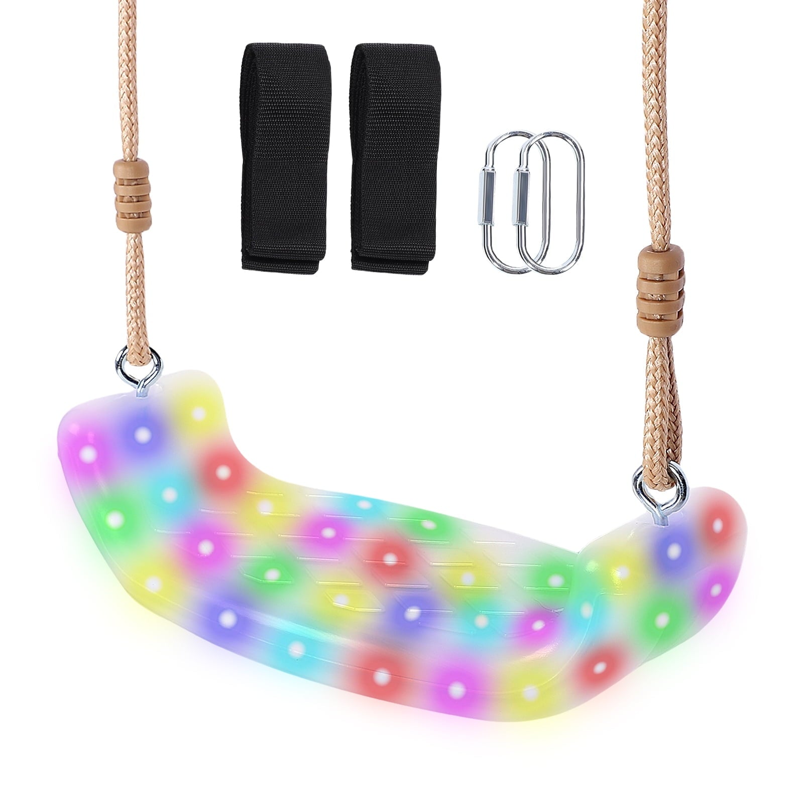 The strong Polypropylene, Semi-Clear Seat with 21 lights is Self encased and weather resistant. This swing has a 78" Rope & Chain that allows for adjusting the length of the swing. Fun and exciting are not the only words to use to describe this swing seat.