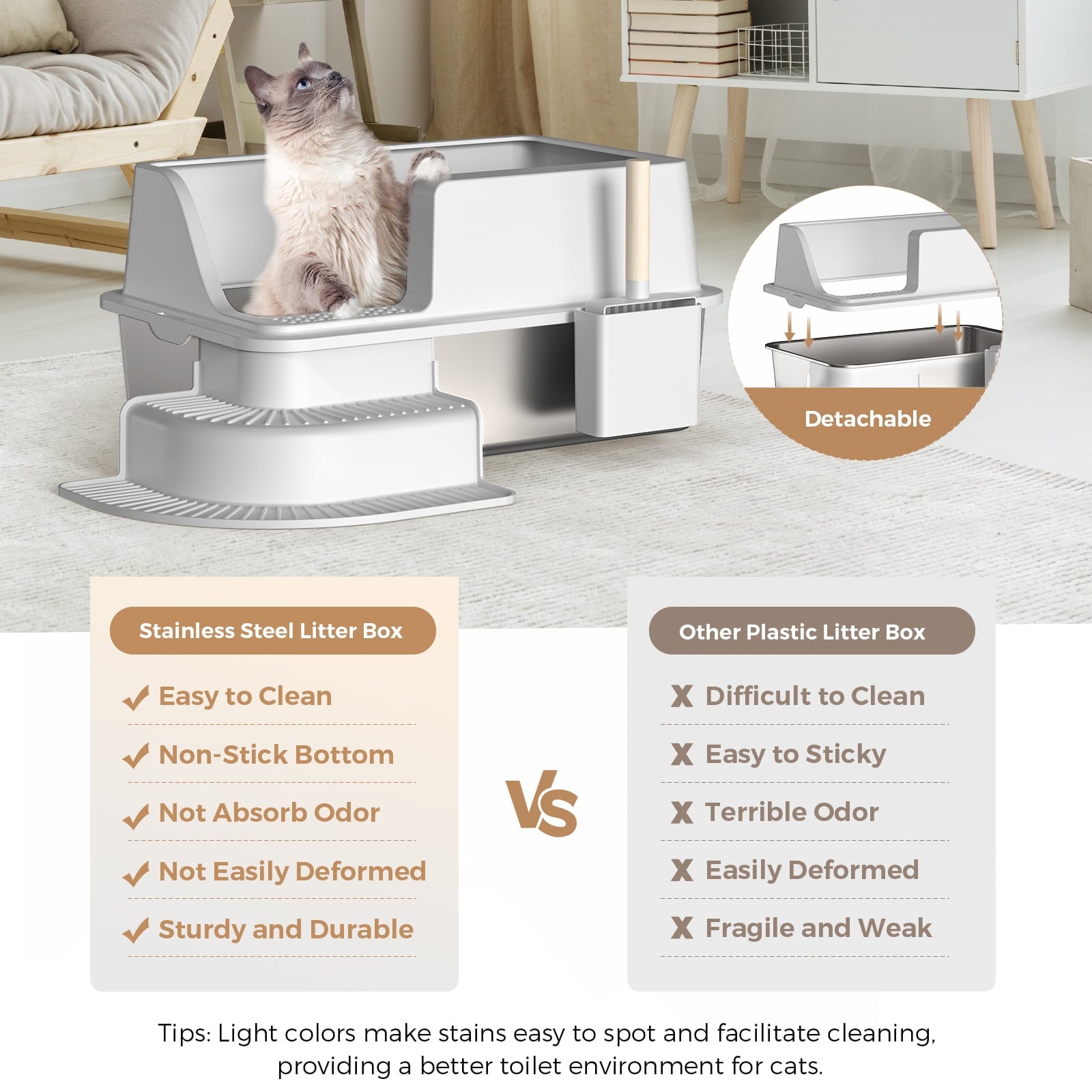 EFFORTLESS CLEANING, ZERO STICKINESS: Bid farewell to sticking issues, making cleaning a breeze compared to plastic alternatives. This significant improvement also impacts odor control positively. If the smell from your current plastic tray is bothersome, switching to our litter box will be a breath of fresh air for your olfactory senses.