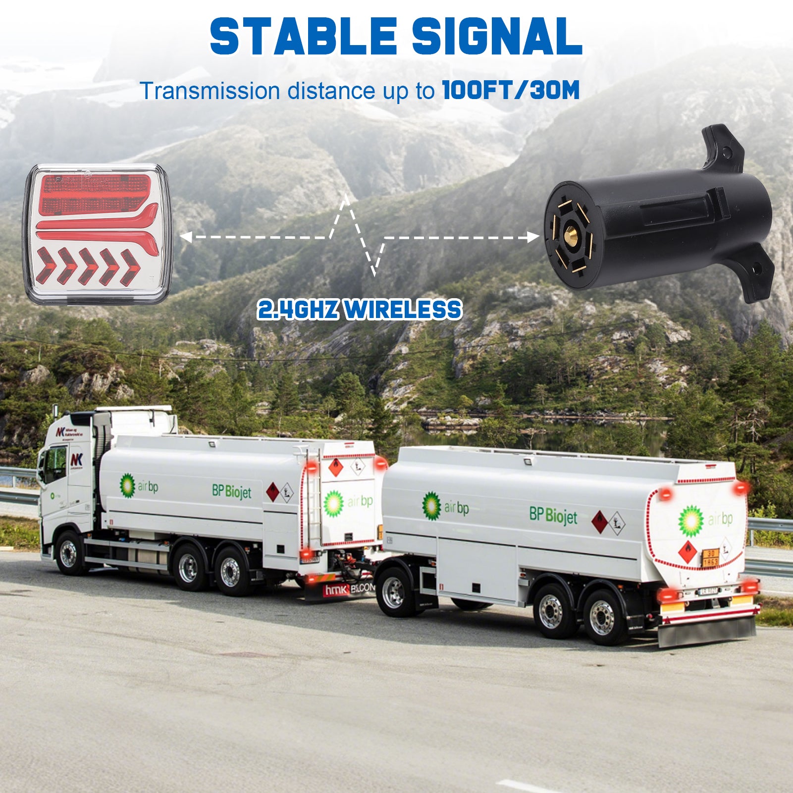 The wireless trailer light features a powerful 2.4GHz signal that reliably transmits up to 100 feet, making it ideal for long distance vehicles and enhancing road safety.