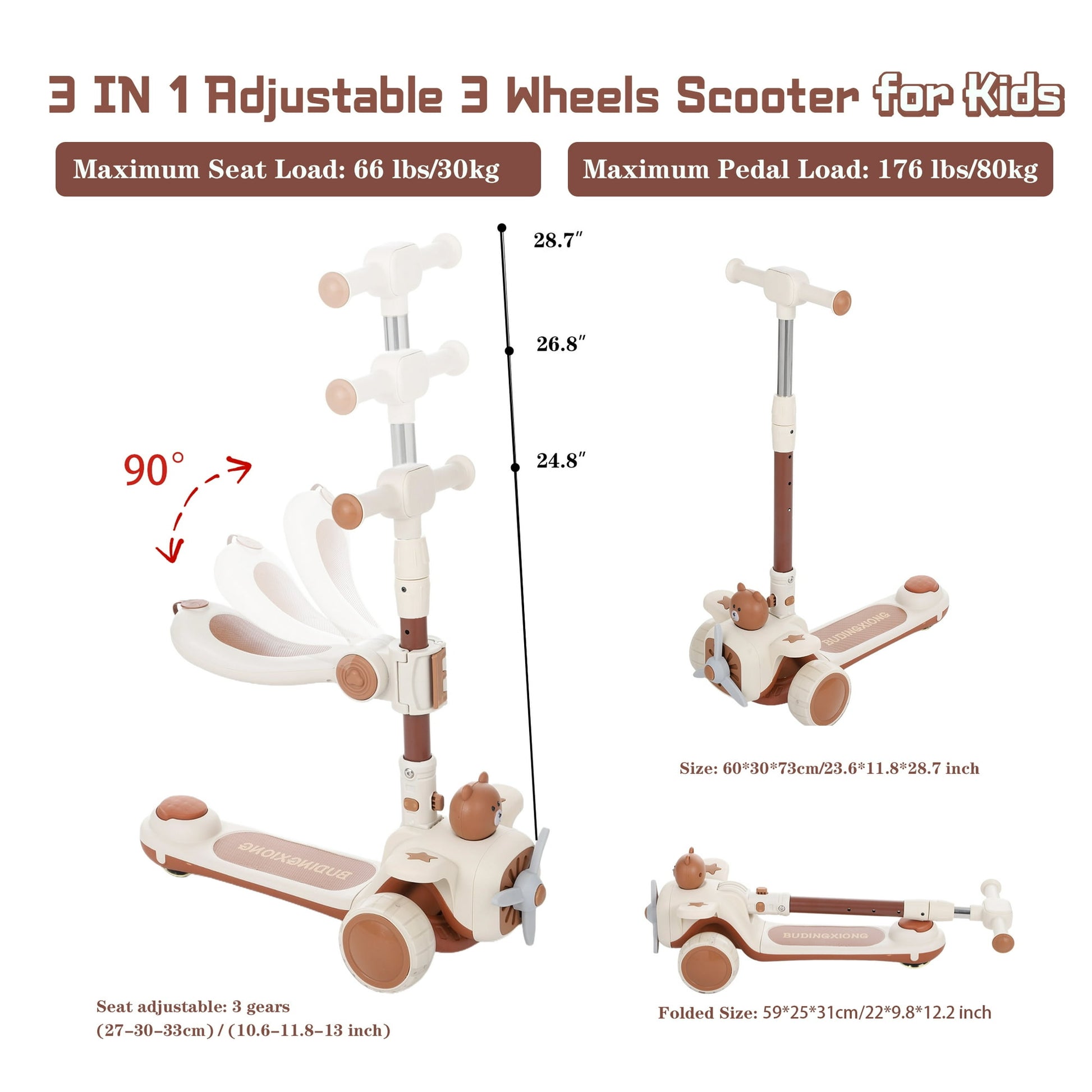 3-in-1 3-Wheeled Scooter for Kids that challenges traditional scooting in a way that's more fun.The removable flip-out seat and foot pad allows your child to scoot sitting or standing up.In addition, our latest scooter also comes with a push handle, so you can push your baby and toddler to walk.This compact scooter is light and it can be folded to carry, fits in the trunk of a car, and fairly easy to store.Little ones are enamored by the LED light-up wheel technology. The flash of rainbow colors is both an exciting attraction to kids and a boost to safety and security.The handle height offers 3 adjustments for better balance and coordination very suitable as a gift for children.
