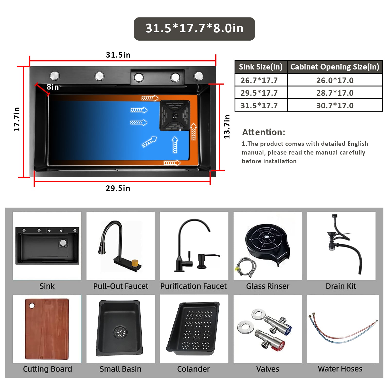 Waterfall Kitchen Sink, Single Bowl Drop in Kitchen Sink with Pull-Out Faucet and Multiple Accessories - 31.5×17.7×8 inch