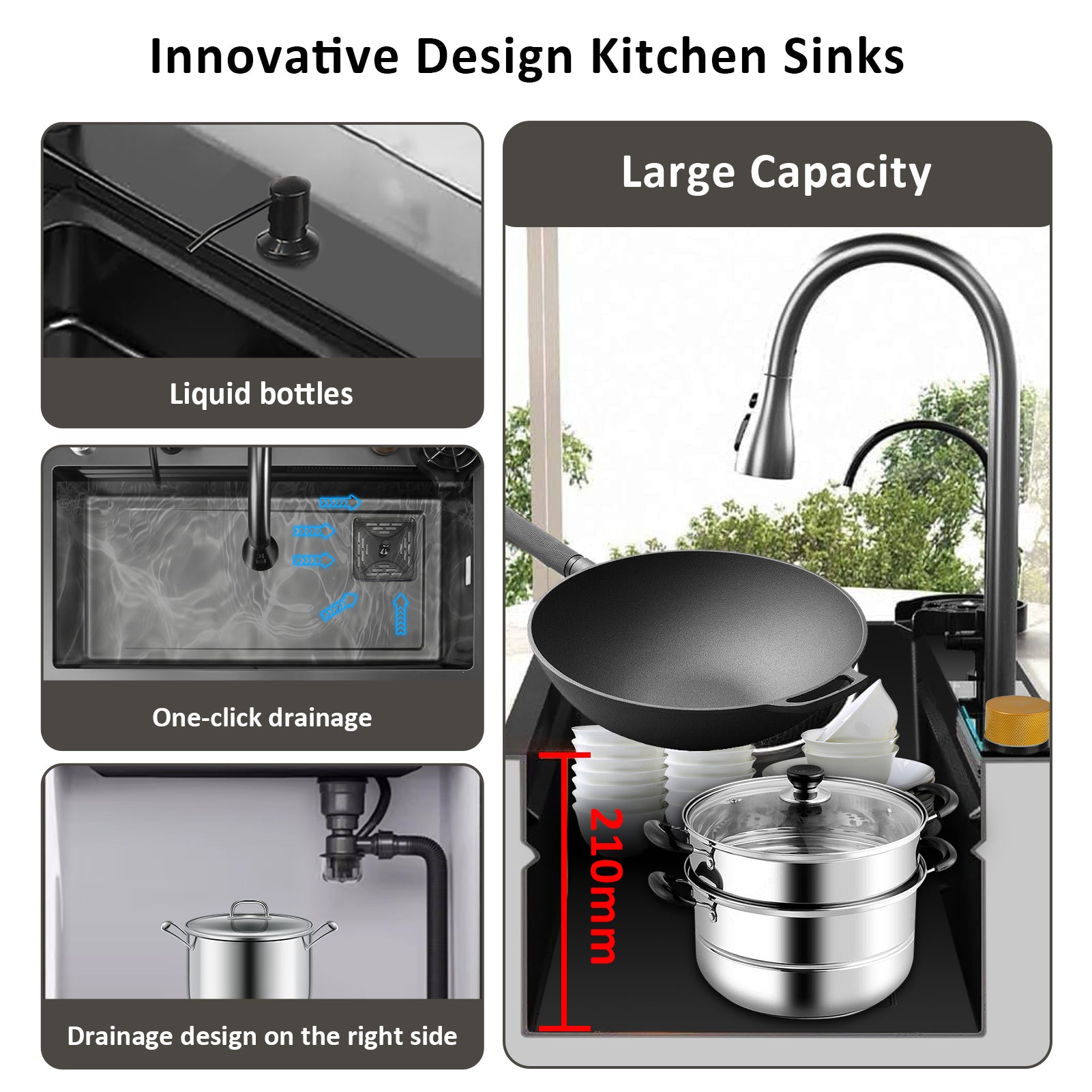 - 🍽️ MULTIFUNCTIONAL SINK: This rotatable rainfall waterfall pull out faucet kitchen sink provides versatility and functionality for any kitchen needs. Offering a more convenient and efficient washing experience.